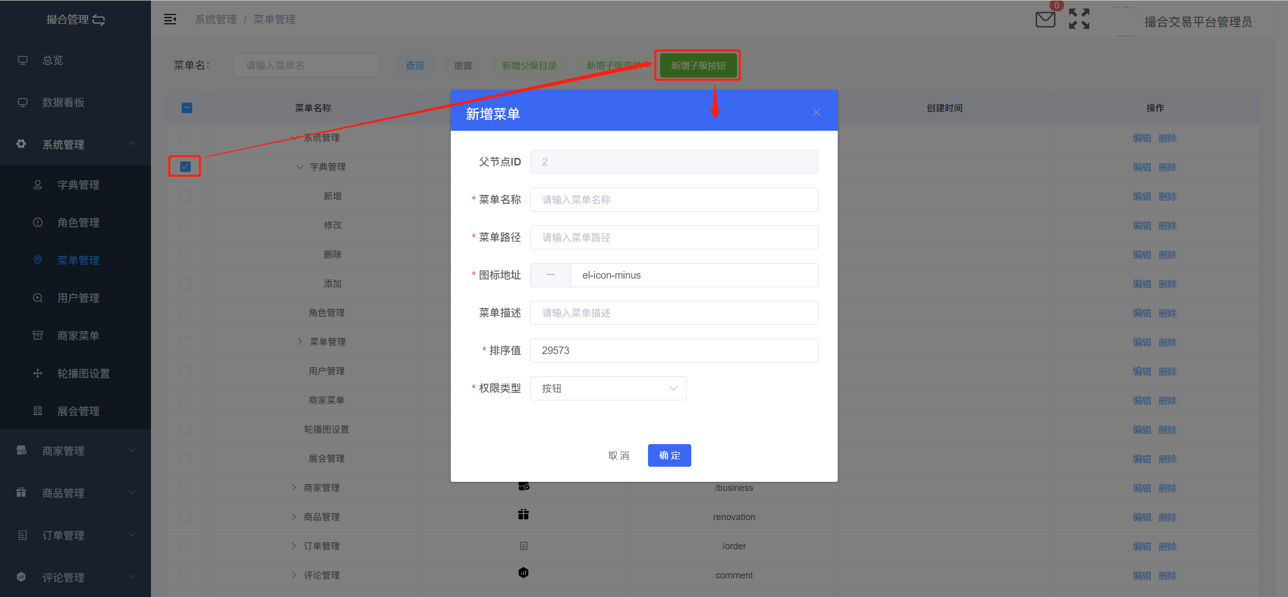 选中一个子级菜单后,点击“新增子级按钮”,设置菜单名称、菜单路径、图标地址、菜单描述、排序值和权限类型,点击“确定”按钮,可以新增子级按钮。