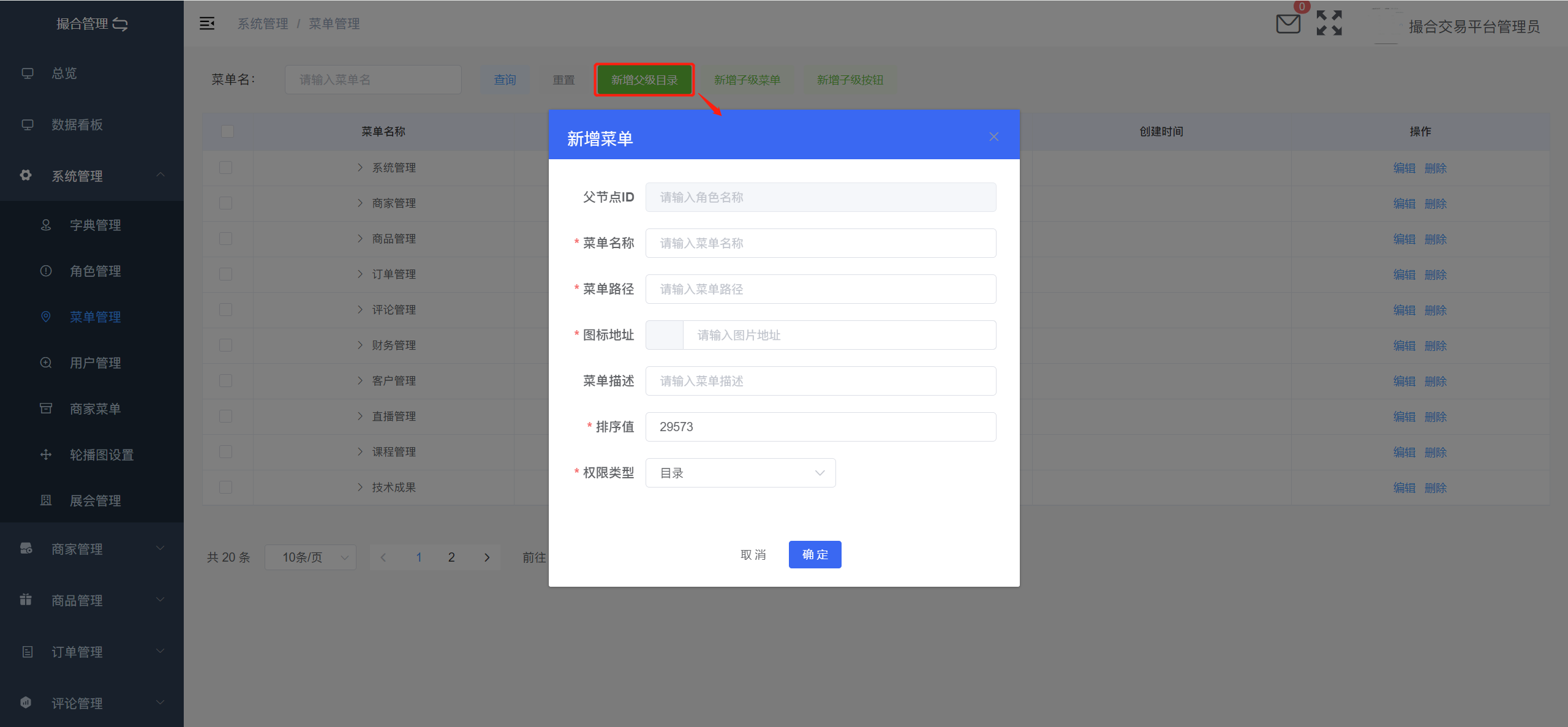 点击“新增父级目录”,设置菜单名称、菜单路径、图标地址、菜单描述、排序值和权限类型,点击“确定”,可以新增父级目录