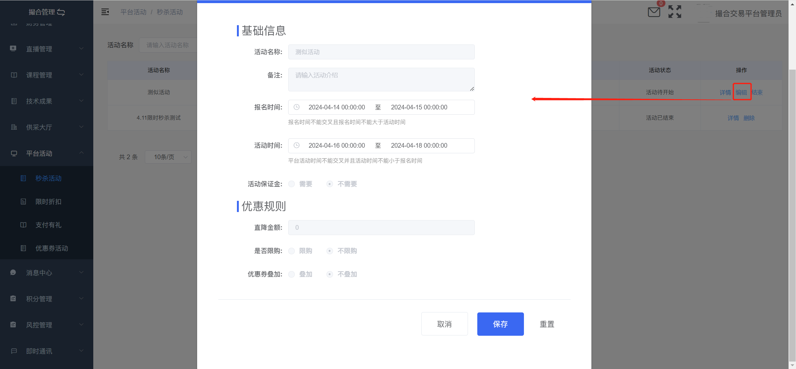 在此页面可以进行撮合平台活动的秒杀活动的设置