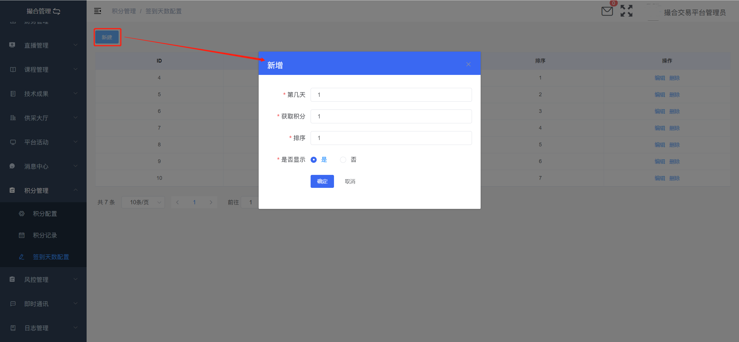 点击“新建”,设置第几天、获取积分、排序和是否显示,点击“确定”,完成新增