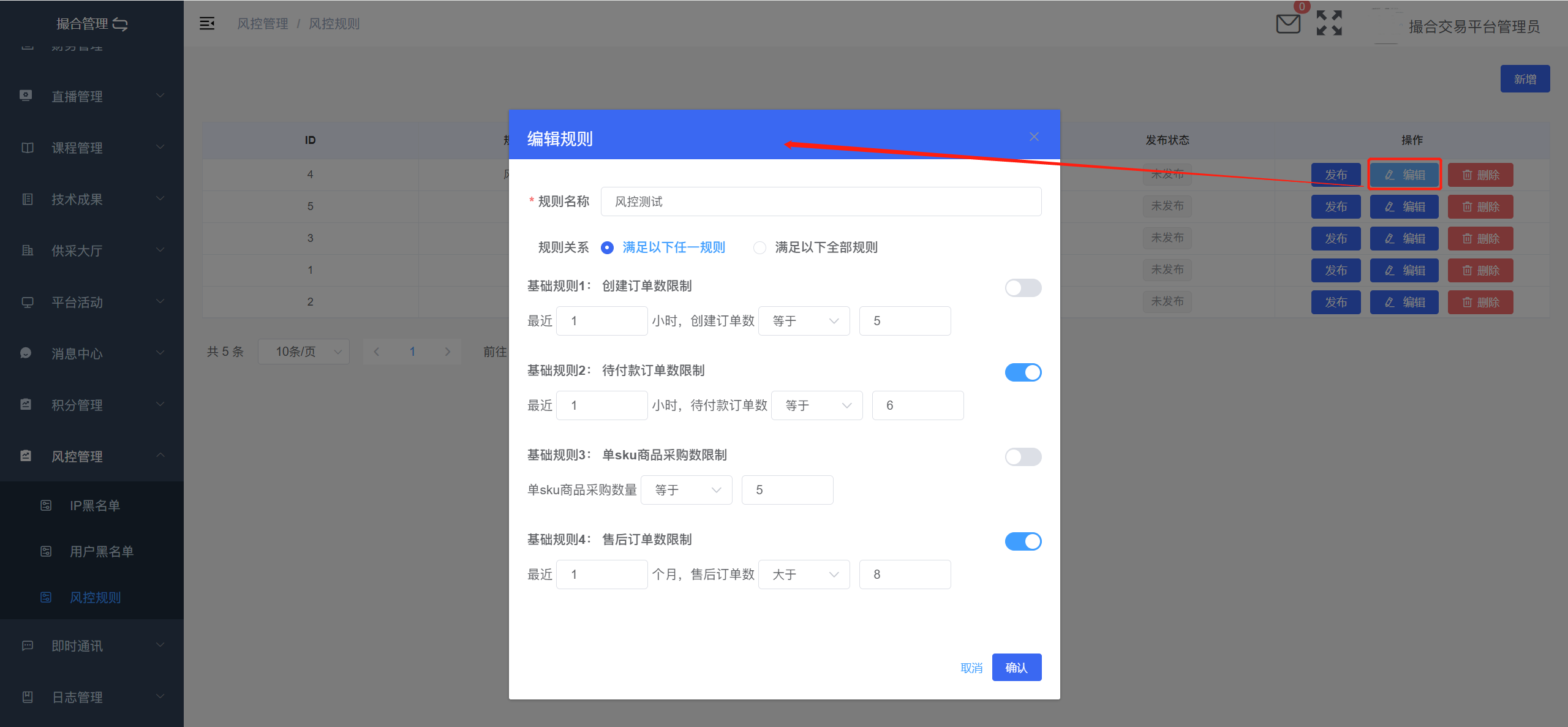 在操作中点击“编辑”,可以对对应风控规则进行设置