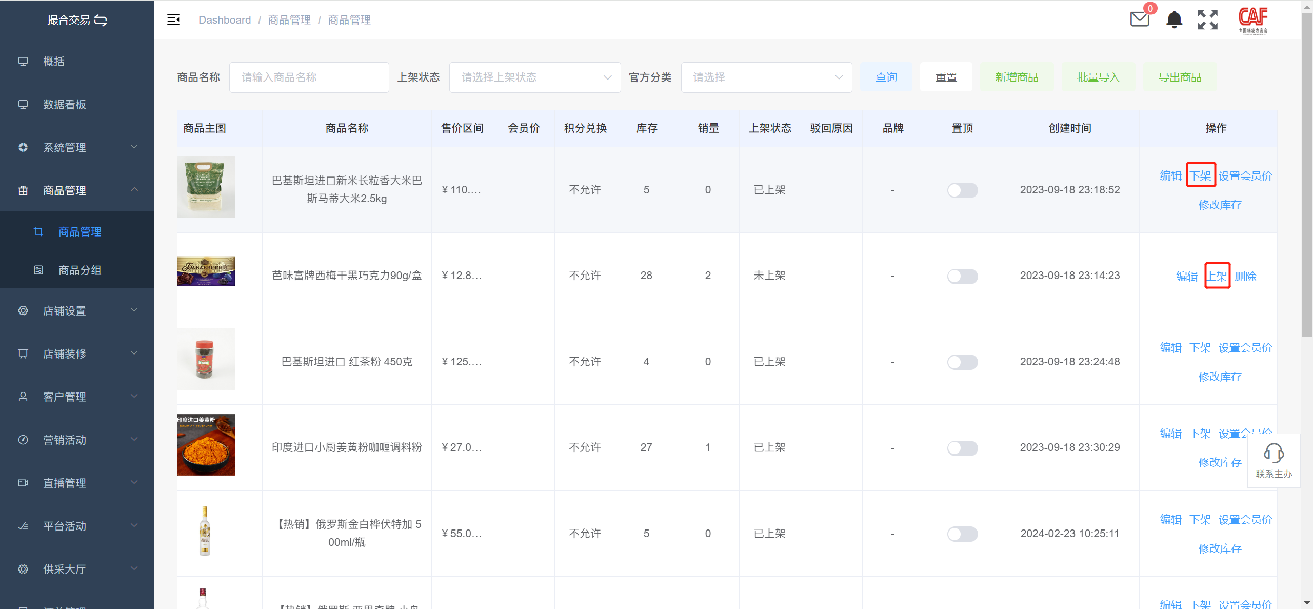 点击“上架”或“下架”可以对商品的状态进行改变