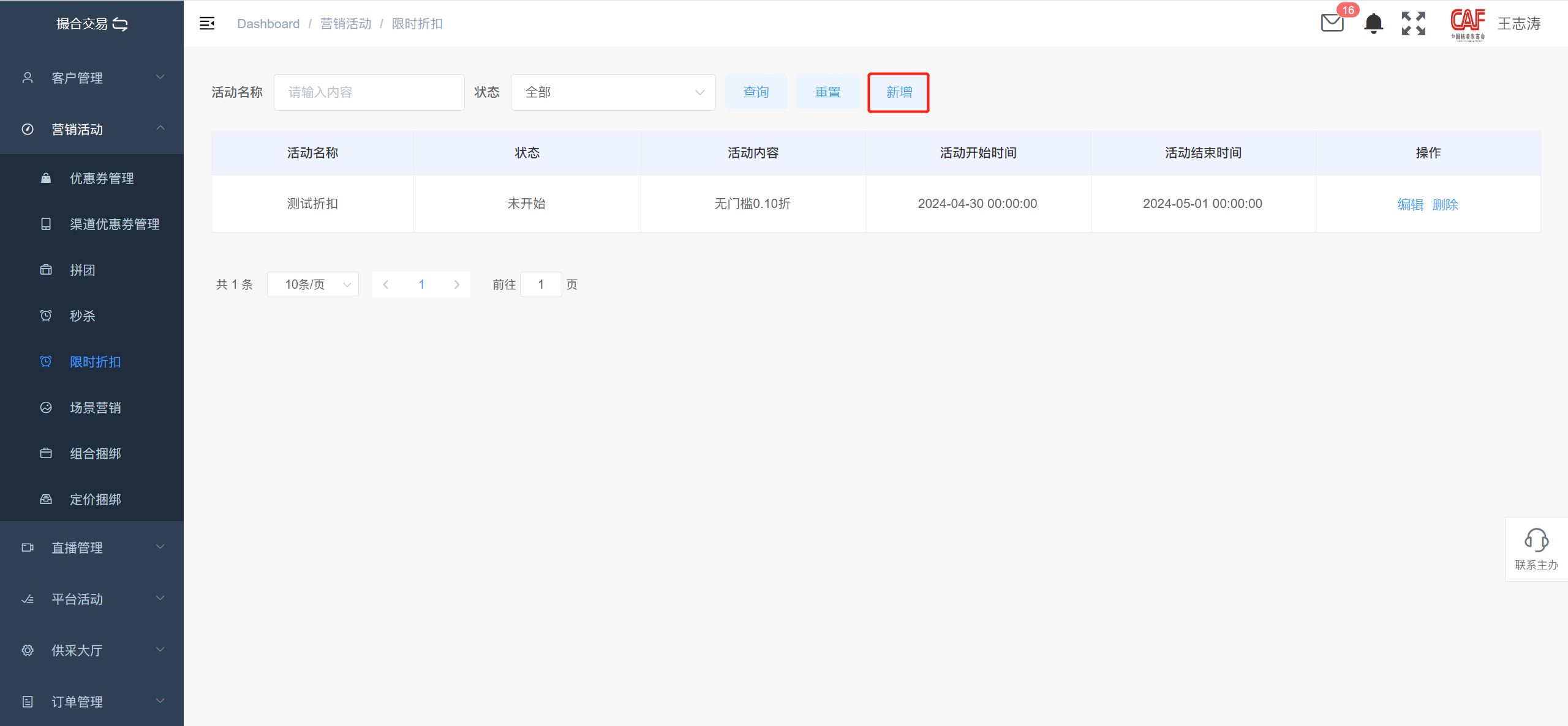 点击“新增”即可设置新的限时折扣活动