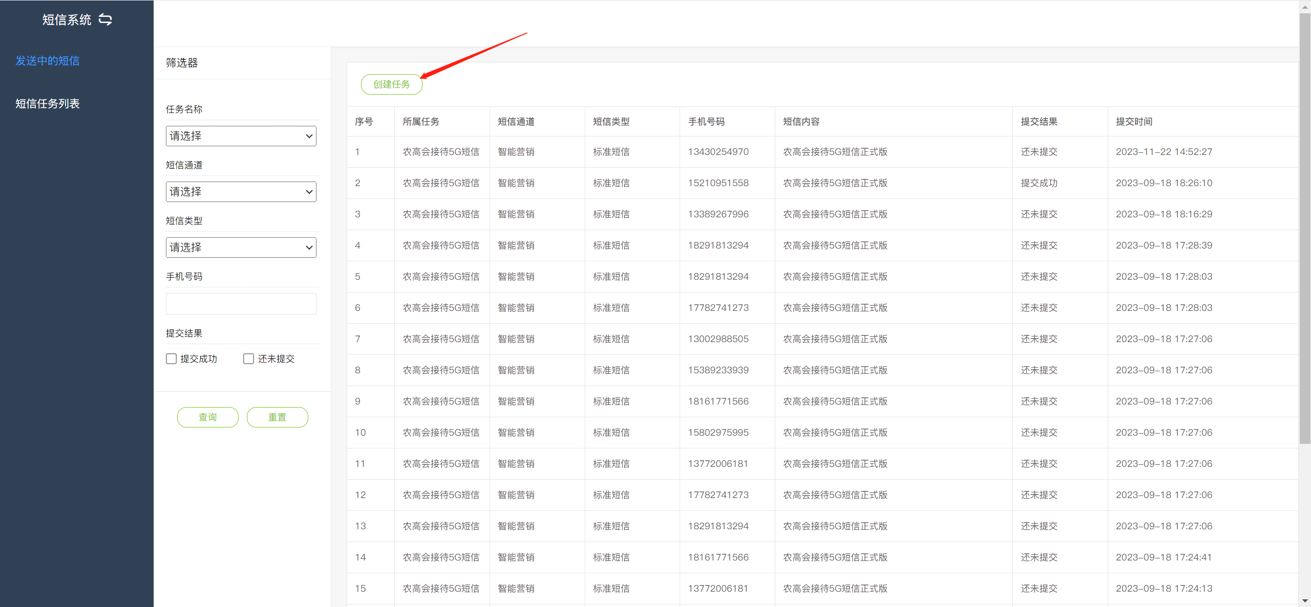 在此页面可以查看所有发送中的短信任务和创建短信任务