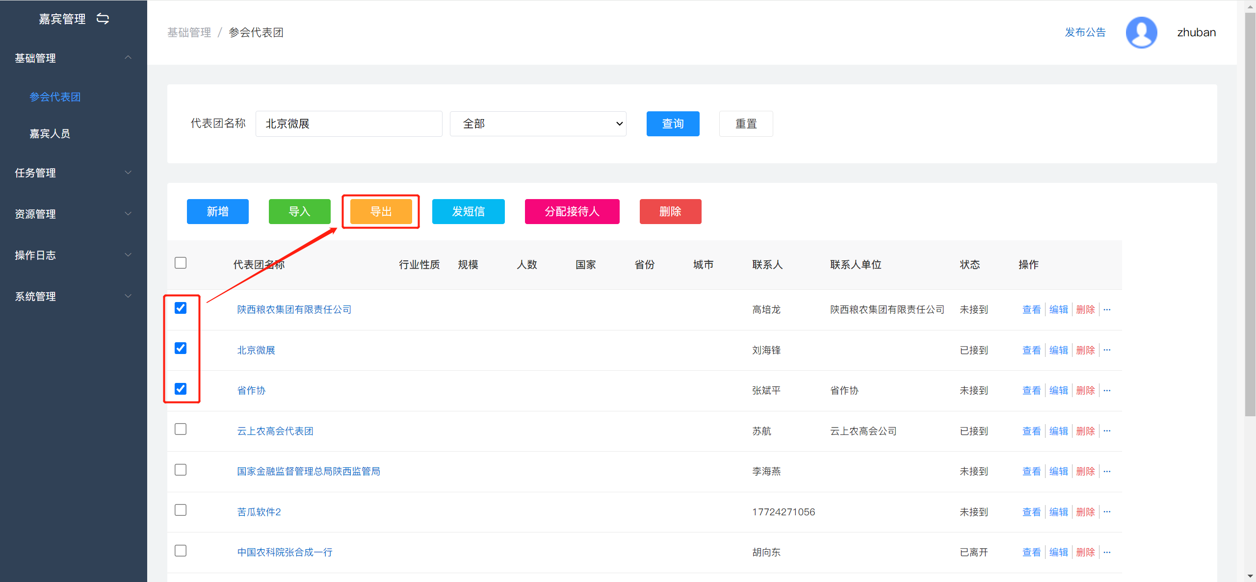 勾选需要导出的代表团后,点击“导出”,即可导出选中代表团的数据表格