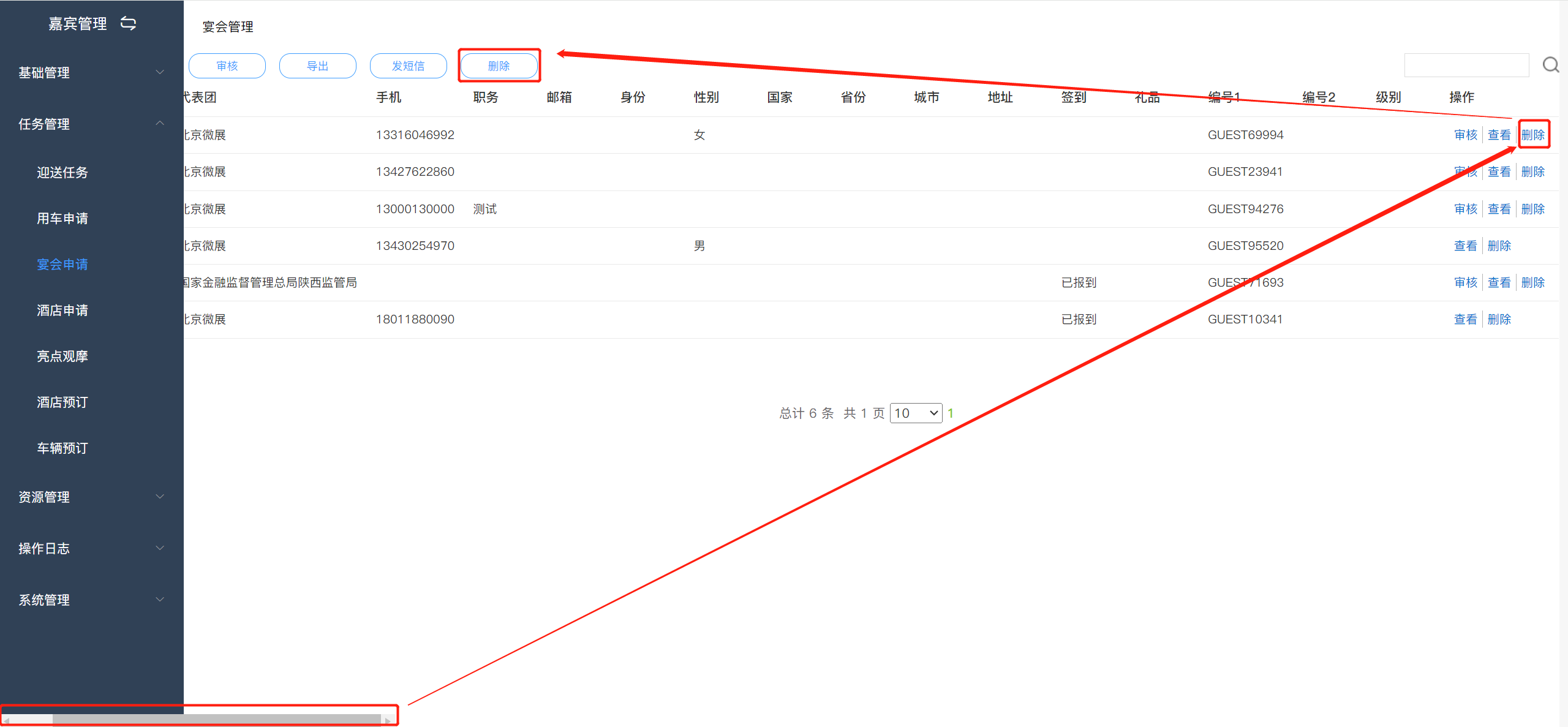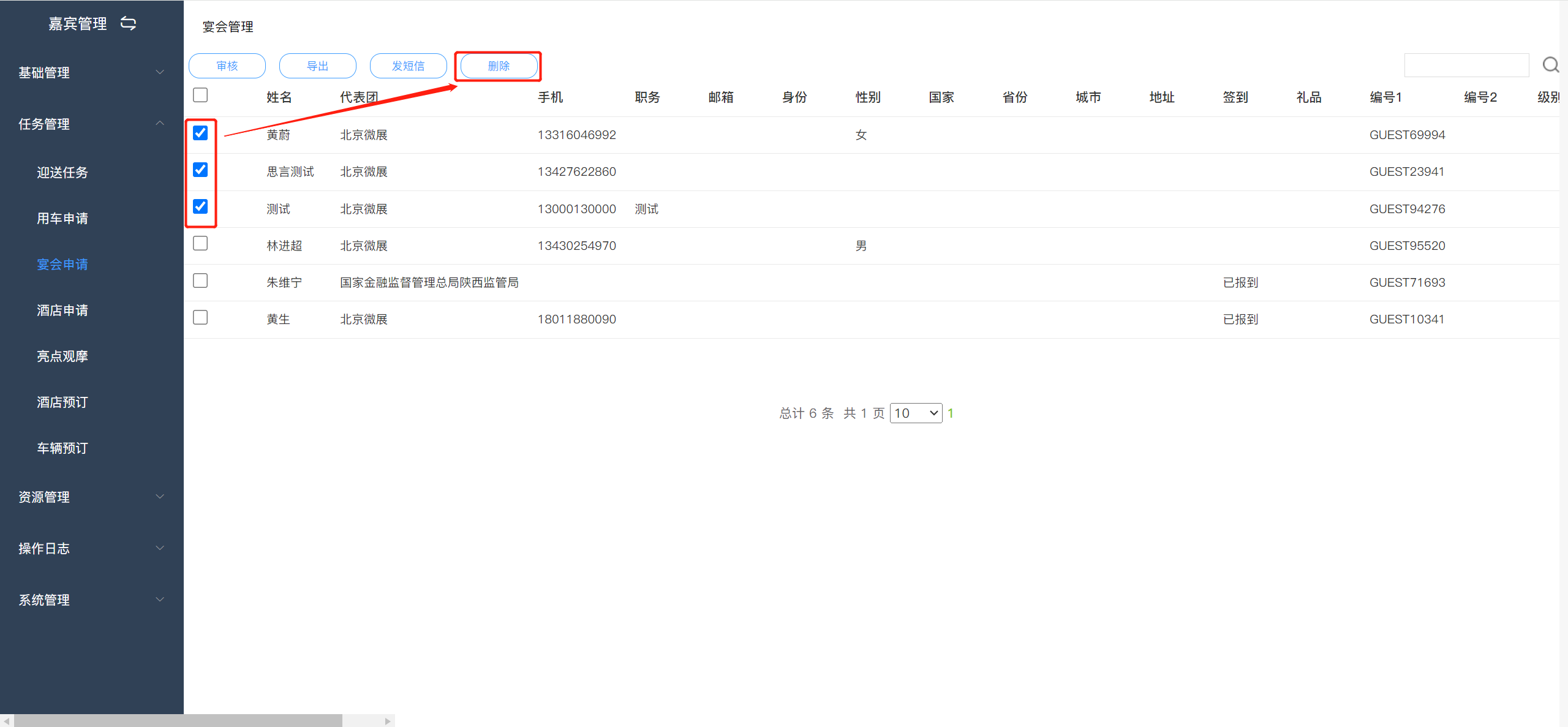 - 批量删除:勾选宴会申请数据后,点击“删除”,即可一次删除选中的多条宴会申请数据
