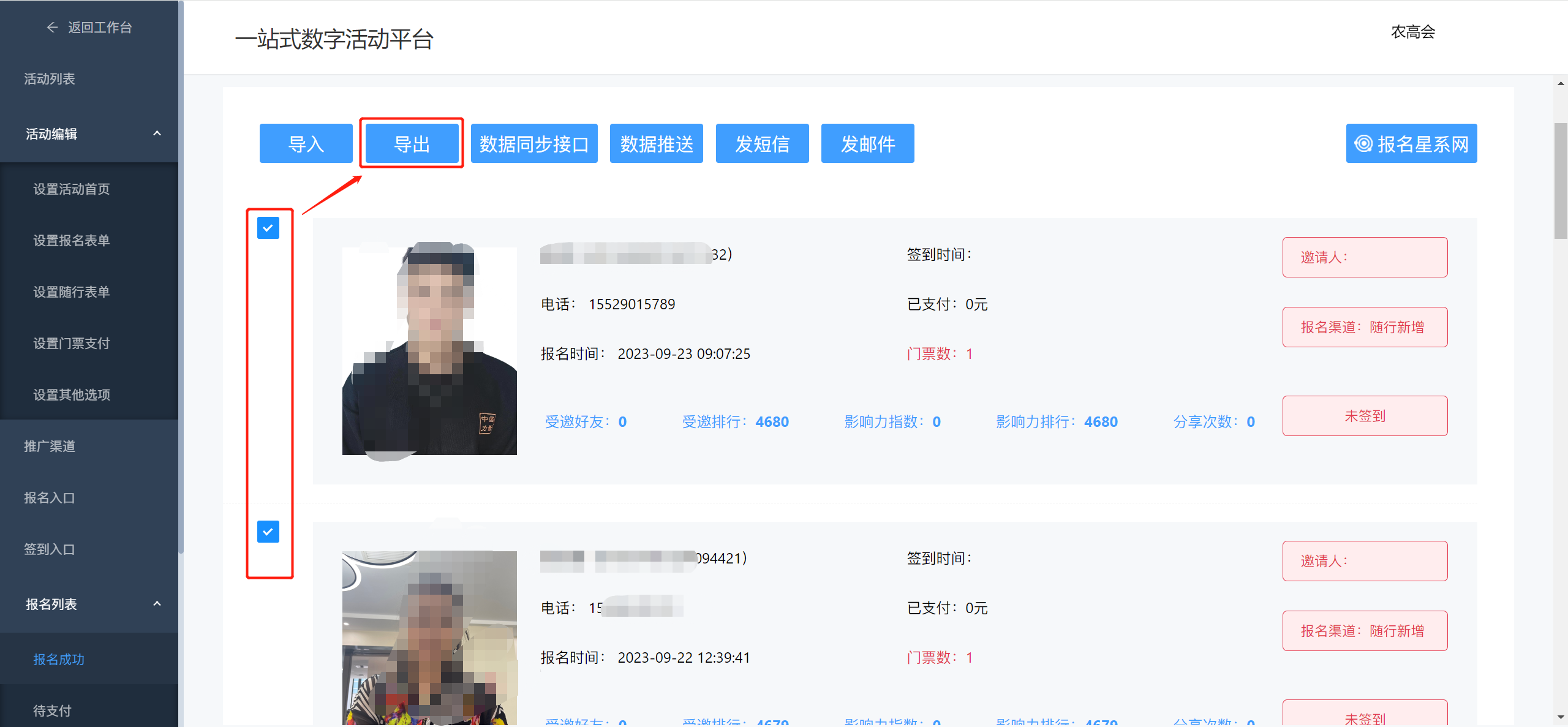 在此页面,主办方可以进行导入、导出,数据同步接口、发送短信/邮件,以及查看报名成功用户的邀请人,报名渠道与签到状态
